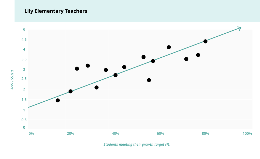 This scatterplot graph has T-TESS scores on the Y-axis (zero to five in increments of 0.5) and on the X-axis is percentage of students meeting their growth targets in increments of 20%. Each dot on the graph represents one teacher. For example, there is one dot that shows a that one teacher had a T-TESS score of two and 20% of that teachers students met their growth target. The dots form a loose line moving up and to the right. There is a line on the graph demonstrating that the dots move up and to the right. Generally, the higher a teacher’s T-TESS score, the higher the percentage of their students meeting their growth target. This graph shows a positive correlation between teachers’ observation scores and the percentage of students meeting their growth targets.