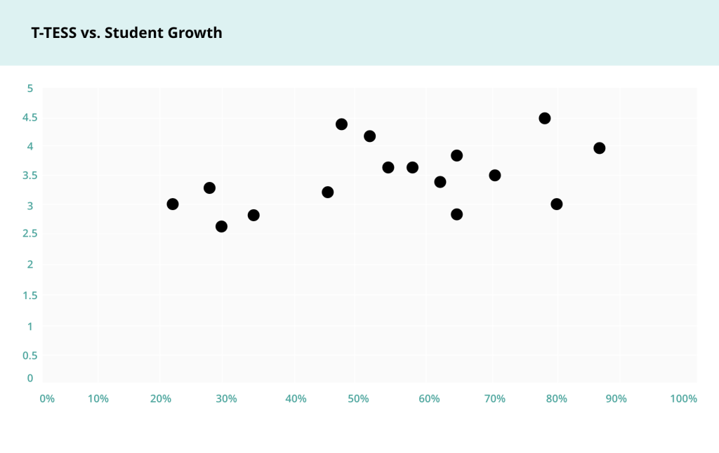 This scatterplot graph has T-TESS scores on the Y-axis (zero to five in increments of 0.5) and on the X-axis is percentage of students meeting their growth targets in increments of 20%. Each dot on the graph represents one teacher. For example, there is one dot that shows a that one teacher had a T-TESS score of four and 20% of that teachers students met their growth target. On this graph, the dots do not form a line. Teachers with higher T-TESS scores are not generally getting more or less students to meet their growth targets than teachers with lower T-TESS scores. This graph shows no correlation between teachers’ observation scores and the percentage of students meeting their growth targets.